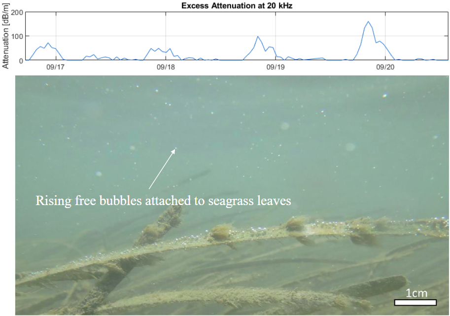 Description: Acoustics are becoming recognized as powerful tools by a variety of ecologists and biologists, but plant acoustics are relatively understudied. I have collaborated with a research group led by Drs. Megan Ballard and Kevin Lee on advancing our ability to use acoustics as a tool for monitoring seagrasses. So far, the group has developed a new effective medium model to describe seagrass sound propagation in a meadow, has designed and deployed an active acoustic system capable of measuring seagrass biomass and productivity, demonstrated that seagrass ebullition is an important component of net ecosystem metabolism, and shown that passive acoustics are viable for measuring seagrass production.